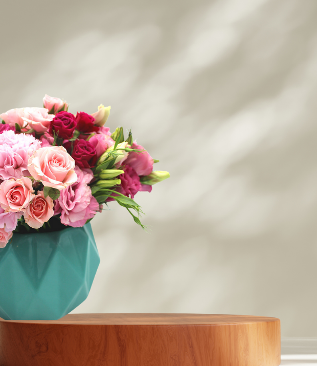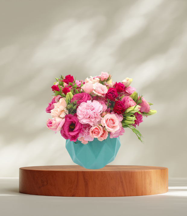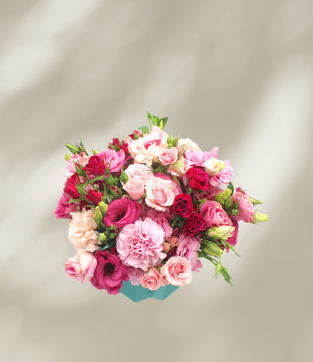 Bouquet de minirosa color claro, rojo y ocre acompañada de clavel yogurt y lisianthus rosa y fucsia en maceta geométrica color aqua.